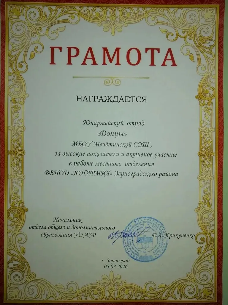 ✨ Самым ярким моментом дня стала церемония признания заслуг наших ребят. За личный вклад в развитие юнармейского движения и активную жизненную позицию самые достойные юнармейцы нашей школы были награждены грамотами Управления образования Администрации Зерноградского района! 📜🏆